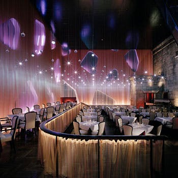 エレベーターが開いた先に広がる別世界。オープンキッチンカウンターを望むライブ感たっぷりの空間、国内最大級の2000本のワインが並ぶ高さ約8メートルのワインセラー、天井から降りそそぐスワロフスキーのライト、まるで宝石箱のようにきらめく、ほかにはないゴージャスな空間、DAZZLE。特別な日のデートやプロポーズに利用する人も多く、日常の喧騒を忘れラグジュアリーな時間を過ごしたい人に最適なモダンイタリアンレストラン。