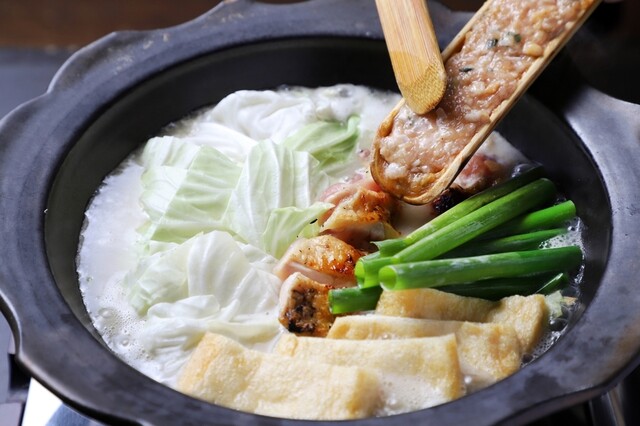 「しろ炊き(鶏白湯)」は、鶏ガラの余分な脂などを丁寧に除去し、8時間以上煮込んだ濃厚なコラーゲンたっぷりの博多風スープが特徴的。鮮度抜群の伊達鶏もも、赤鶏手羽元、自家製つくねと旬菜でいただく。