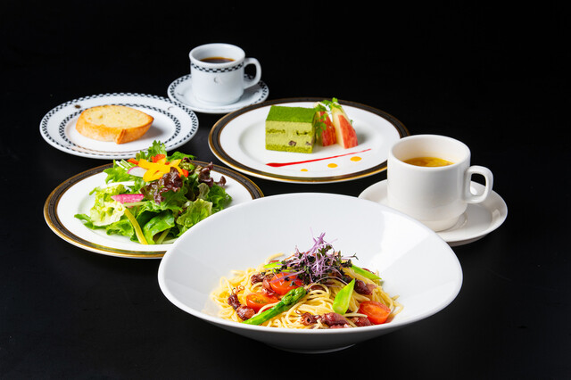 ランチタイムには、帝国ホテルグループの洋食をリーズナブルな価格で提供。パスタ、ハンバーグ、カレーなど、親しみやすいメニューがそろう。カレーは帝国ホテル伝統の一品で、スパイスと香味野菜の奥深い味わいをぜひ一度ためしてほしい。