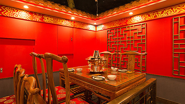 飲食店のひしめく西一番街入口すぐ、池袋演芸場が入るビルの6階。中国王朝をイメージさせる華やかな雰囲気に心がおどる。特別感あふれる空間で楽しめるのは、北京伝統の七宝焼き「景泰藍(ちんたいらん)」でいただく豪華な火鍋。