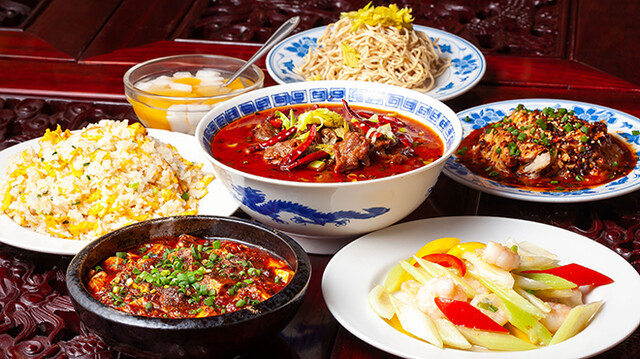大量の唐辛子がインパクト抜群の「歌楽山辣子鶏」や定番の「麻婆豆腐」など、辛さが病みつきになる人気メニューがズラリと揃っている。