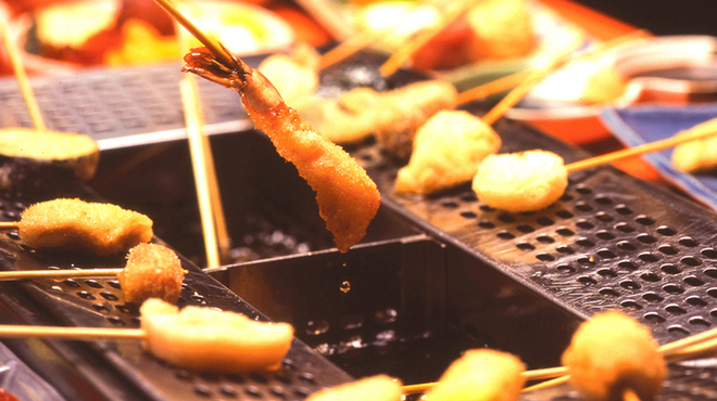 自由に串揚げのネタを選んで自分で揚げるスタイルがアトラクション的な楽しさがあると好評だ。串揚げ専門店だが、食べ放題になるのは串揚げだけでなく、サラダやお惣菜にケーキやフルーツ、お茶漬なども含まれるため、ファミレス感覚で楽しめる。