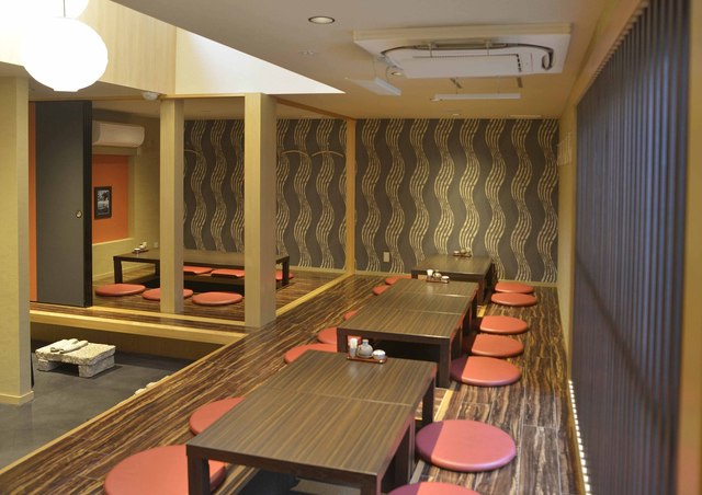 皮までおいしく食べられるように焼き方にもこだわっていて、1階のカウンター席では焼きあがる様子を目の前でじっくり楽める。2階には落ち着いてくつろげる掘りごたつ席があり、大規模な宴会も可能。