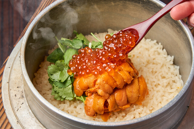 そんな居酒屋こころの中で特におすすめしたい料理が、「釜めし」だ。石川県能登半島の裏さんという方が作った上質なコシヒカリを使用し、「雲丹といくら」(2,200円)や「釜揚げしらすと炙り明太子」(1,800円)など、贅沢な食材を使用した釜めしは絶品の味わい。