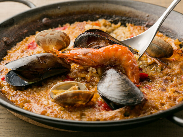 ランチタイムには、「鹿児島県産 魚介のパエリア」や「篠島産 しらすと大葉のパエリア」、「炭火焼きした地鶏と万願寺唐辛子のフィデワ」といった、産地にこだわったスペイン料理を堪能することができる。