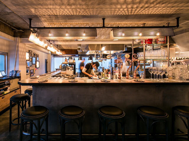 店内に入ると、広々としたオープンキッチンが目を引く、おしゃれで開放的な空間が広がる。キッチンに面したカウンター席はデートにぴったりな雰囲気。
