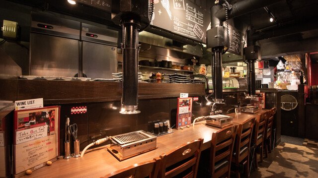 黒を基調としたシックな店内は、間接照明が灯るおしゃれな雰囲気。ライブ感たっぷりのカウンター席は、大人なデートにおすすめだ。