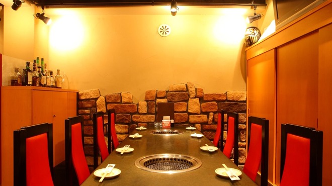デートに使える2人から4人用の半個室や、接待や記念日に使える4人から8人用の完全個室がある。インタリアや照明はシックで落ち着きがあり、高級感を感じさせる。お店は半地下ということもあり、窓がすくない。その密閉感が隠れ家で焼肉をしているような感覚になれる。店員の細かい対応や丁寧な肉や食べ方の説明なども評判が良い。