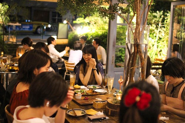 緑に囲まれた開放的なオープンテラスで、クッション付きのソファースタイルとなっている。女子会にぴったりな空間で、駅前ながら時間を忘れてゆっくり過ごすことができる。昼と夜とで雰囲気がガラッと変わるのも印象的だ。