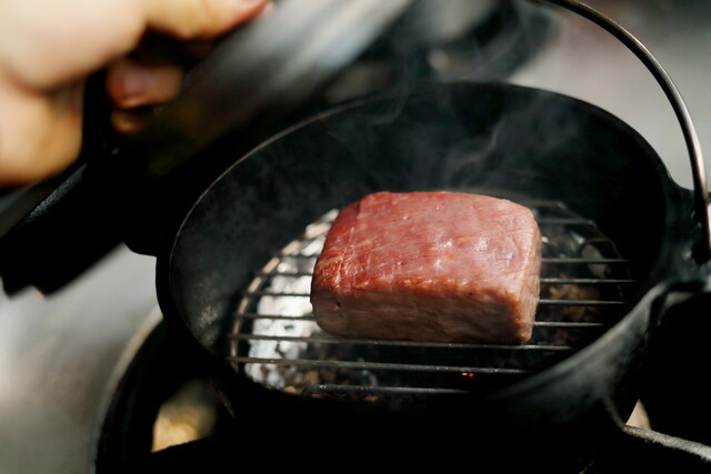 ダッチオーブンを使ってその場で瞬間燻製する黒毛和牛は、テーブルの上で立ち上る煙も臨場感抜群。一緒に燻製した溶き卵にくぐらせて食べ、余った卵で卵かけごはんもできる。