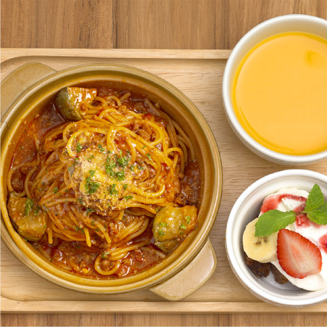 平日限定ランチは、パスタやピザ、グラタンがセットになって1000円のお値打ち価格。このほか、限定10食のステーキランチなどがある。また、土曜、日曜、祝日はサラダ、パスタ、ビーフステーキにデザートまで付く、ちょっとリッチなランチコースが用意されている。のんびりとした休日ランチにおすすめだ。