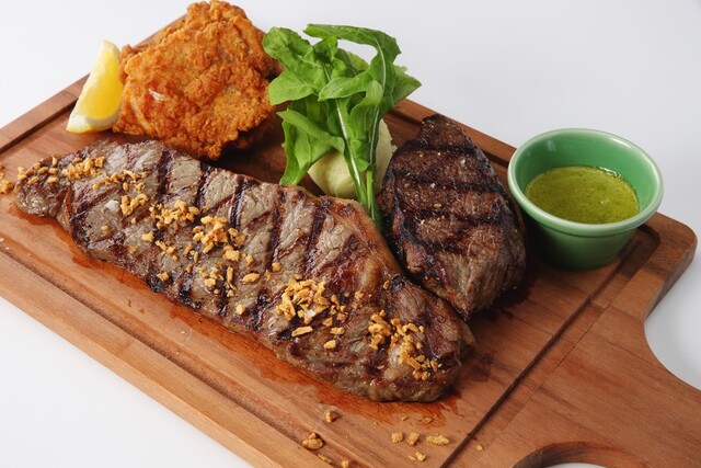 おすすめは「肉盛りスタンダード 2-3p share」(3,080円)。お店イチオシのオーストラリア産短角牛サーロインとフライドチキンが一度に味わせる満足感たっぷりのお肉プレートだ。