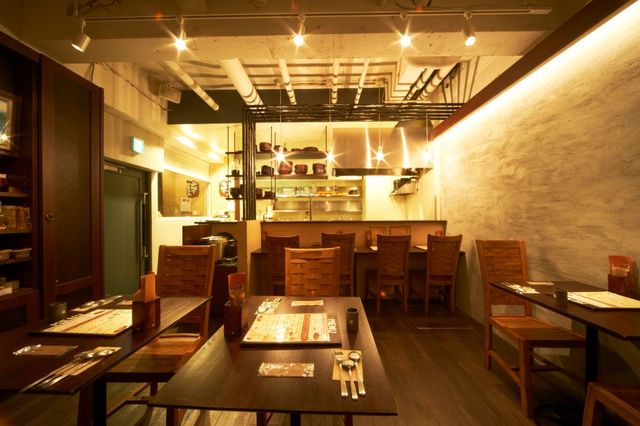 地下1階に位置する店内は、暗めの照明で落ち着いた印象。コンパクトなつくりだが、席と席の間が空いているため、ゆっくり過ごすことができる。席数は少ないが、キッチンが見渡せるオープンカウンターも人気だ。