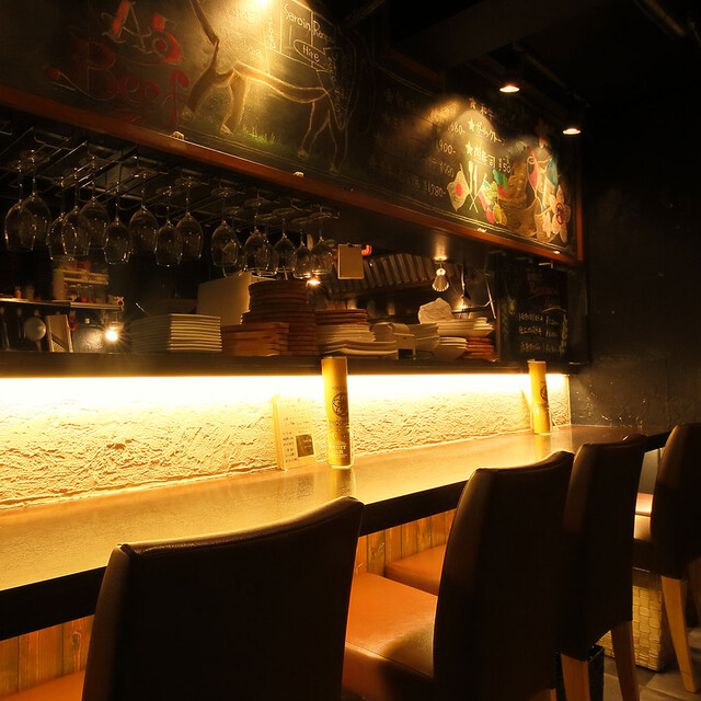 隠れ家風のモダンでおしゃれな店内は、照明が抑えられた大人な空間。女子会や友人同士にぴったりなテーブル席。カウンターは、おひとりはもちろん、デートにもぴったりなムード抜群の雰囲気だ。天気の良い日にはテラス席も開放している。