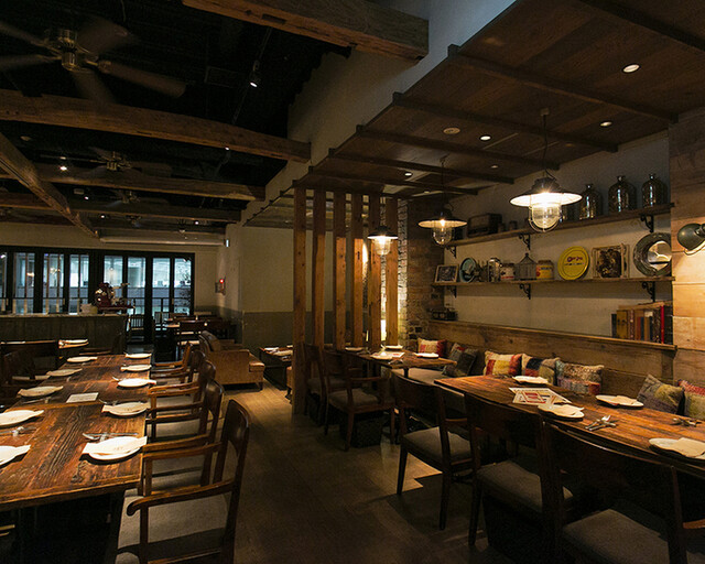 開放的でお洒落なテラスや、廃材や中古家具をリユースして作り上げられた空間、木材家具が心地よい温かみのあるテーブル席など、様々な面を持っている。