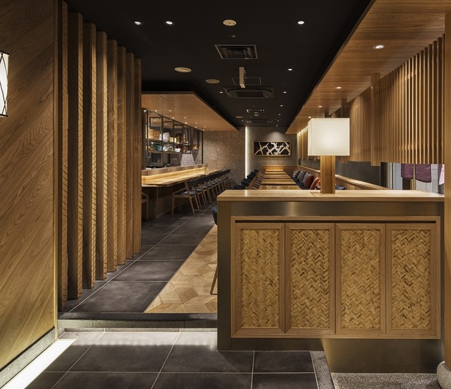 オープンキッチンの店内は、深い色合いの木製のテーブルや、タイル張りのカウンター、無骨な天井などが心地よい調和を生み出し、洗練された空間を生み出している。
