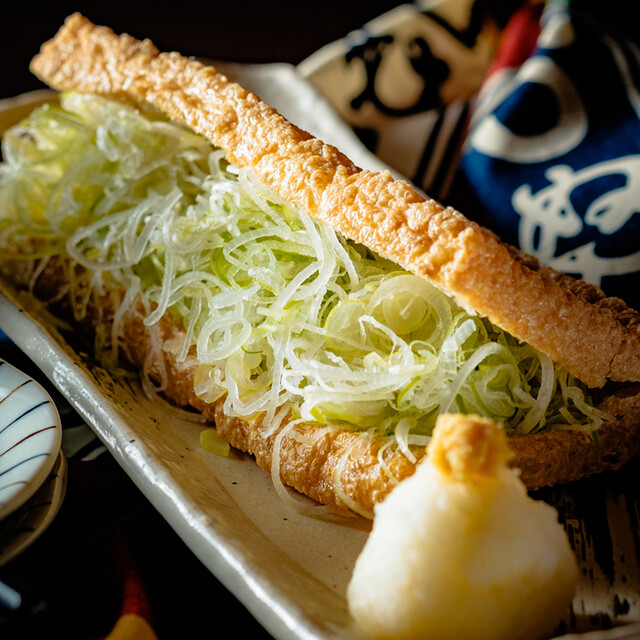「栃尾油揚げ」は、高温での2度揚げによって、バリッとした食感が特徴的だ。たっぷりの葱を挟んで、新潟県産の日本酒と一緒に食べると、感激するほどに美味しい。