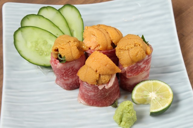 中でも圧倒的な人気を誇る名物メニューが、「ウニの肉巻き」だ。上質なウニをA4和牛で包んだ至極のコラボ料理。
