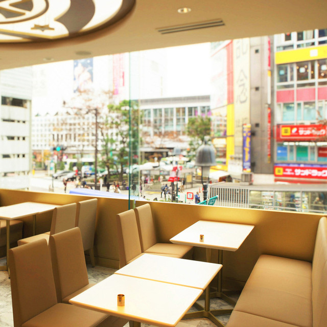 総席数124席の店内は、広々とした清潔感溢れる空間。大きな窓側の席からは、スクランブル交差点や道玄坂といった渋谷のメインエリアを一望することができる。