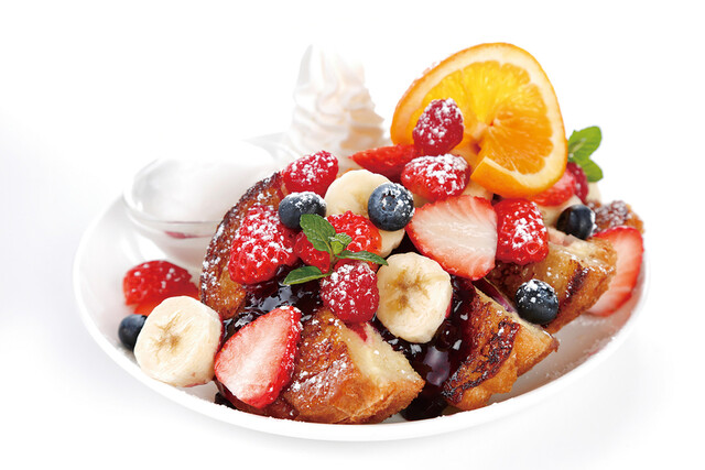 パンだけでなく全ての食材にこだわったフレンチトーストの中でも、抜群の人気を誇るメニューが「ベリーデラックス」(1,800円)。クリームチーズやストロベリー・ブルーベリージャムをサンドし、上からいっぱいのベリーがトッピングされたボリューム満点の一品だ。