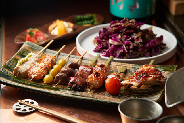 ブームとなった野菜巻き串の他、定番の焼き鳥メニューや博多料理を楽しむことができる。デートにぴったりなカウンター席のほか、女子会や宴会などにおすすめな個室も完備している。