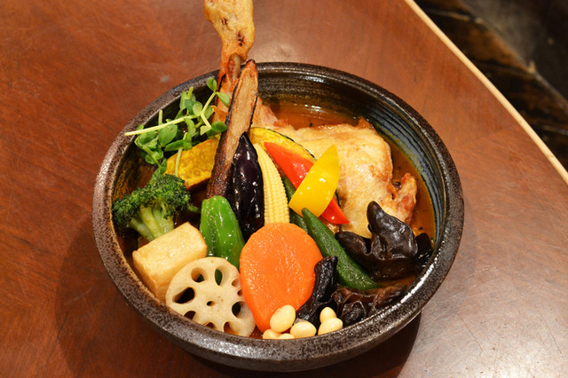 スープの分も合わせると1皿になんと約450gもの野菜が入っているスープカレーで、チキンはパリパリか柔らかを選択可能。カレーの街で確かな実績を築いてきた、実力店の確かな美味しさをぜひ一度味わってみてはいかがだろうか。