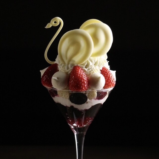 シーズンごとに変わるパフェは6種類ほど。白鳥のように美しいパフェや花畑そのものの色鮮やかなパフェ、見るだけで心も踊る。もちろん味も格別で、最後まで飽きずに楽しめる。