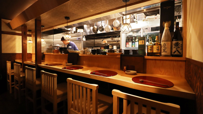 オープンキッチンのカウンター席では、職人による華麗な手さばき、焼きさばきを目の前に。香ばしい香りと炭火の音が食欲を刺激するでしょう。