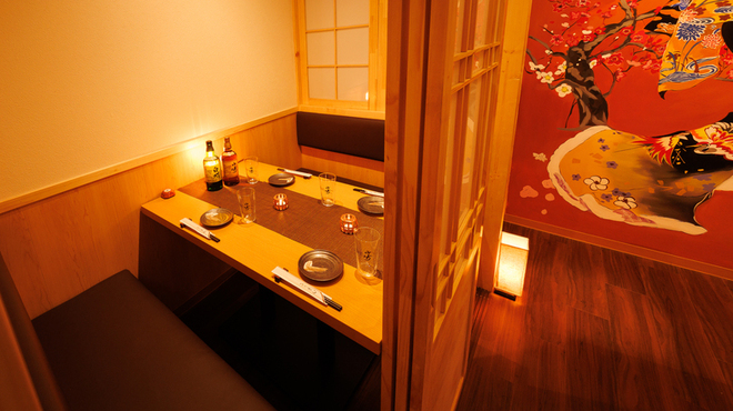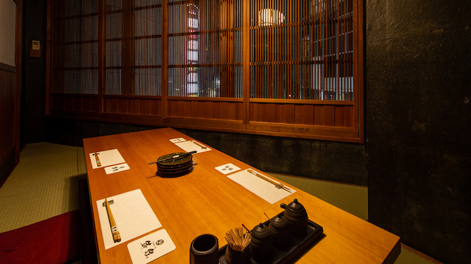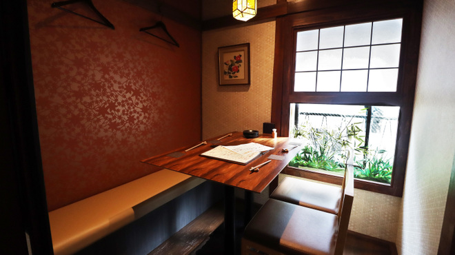 程よい広さの店内はカウンター、テーブル2席のほかはすべて個室。障子から見える草花やレトロなランプが、隠れ家的な雰囲気を演出します。喫煙ブースがあるので喫煙者にも安心。品格と落ち着きを兼ねそろえた空間は特別な日にも最適でしょう。