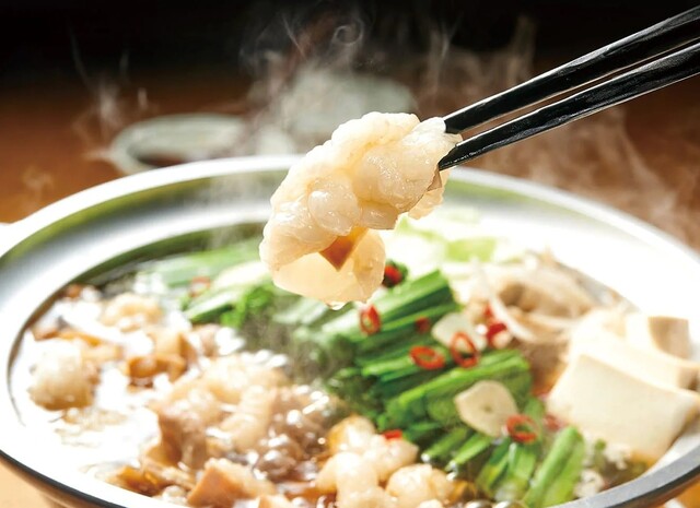 看板料理の「博多牛もつ鍋」はぷるぷるのもつの旨味がたっぷり。にんにくの香りと鷹の爪の辛味が食欲を増進します。〆には雑炊のほかちゃんぽん麵もあり、余すことなくモツの魅力を堪能できます。