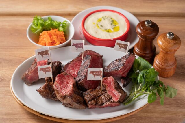 人気メニューは最上級A5和牛シャトーブリアンステーキだ。ミディアムレアで仕上げてあり、玉ねぎベースのソースやワサビ、柚子胡椒風味の大根おろし、岩塩、フライドオニオンが添えられている。