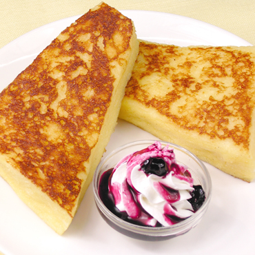 フレンチトーストと言ったらメープルシロップの印象が強いと思うが、こちらのスタンダードはブルーベリーソ-スだ。