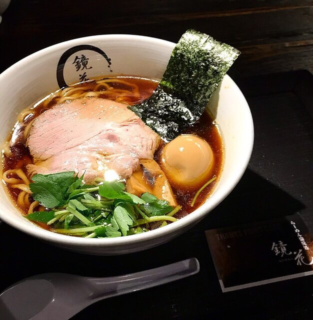 鏡花の看板メニューは、21種類の厳選素材から取った出汁に数種類の醤油を合わせ、焦がし醤油、鴨油と名古屋コーチン油をアクセントにした「醤油ラーメン」。