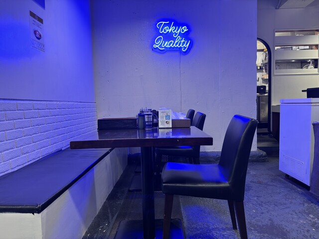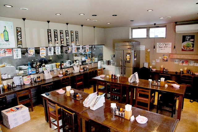 ラーメン店には珍しく広々としたテーブル席を配置した店内は、子供連れやグループでも入りやすいと評判を得ている。