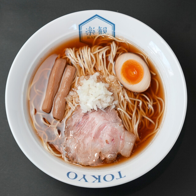 楽観の基本メニューは、「琥珀」と「真珠」の2種類。木桶仕込みの一等醤油と高級鰹出汁を使った和風味の「琥珀」は、透き通った琥珀色のスープにトッピングの刻み玉ねぎが優しい甘さを演出する一級品。