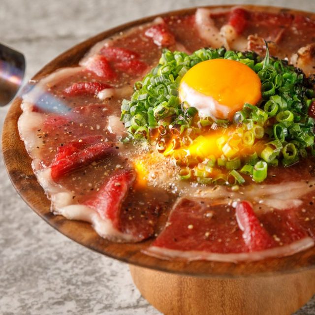 こちらの名物は、見た目も鮮やかな「霜降り牛の炙りカルパッチョ 」。黒毛和牛の霜降り肉を贅沢に使用した”お肉のカルパッチョ”で、目の前で炙るパフォーマンスはデートや女子会で喜ばれること間違いなし。口に入れた瞬間にとろける幸せをぜひ体感してほしい。