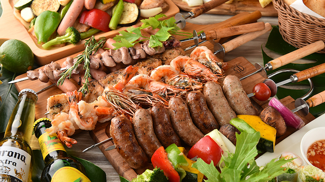 おすすめは12品の料理に3時間の飲み放題がついた「ビアガーデンシュラスコBBQ食べ放題コース」(食べログ)。