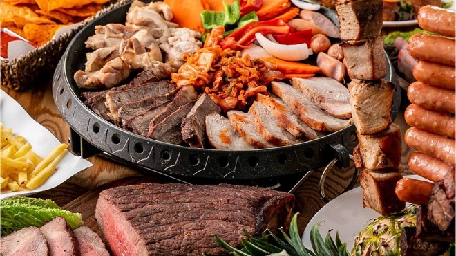 BBQメニューには新大久保らしくサムギョプサル食べ放題も用意。「食べ放題付きビアガーデンBBQコース」は2時間の食べ飲み放題で税込3,960円(ホットペッパーグルメ)。