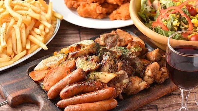 食べ放題のBBQプレートを含む10品の料理がついた「人気ビアガーデン10品コース」は税込2,980円(食べログ)。ビーフ、ポーク、チキン3種のお肉にソーセージや野菜も食べ放題です。