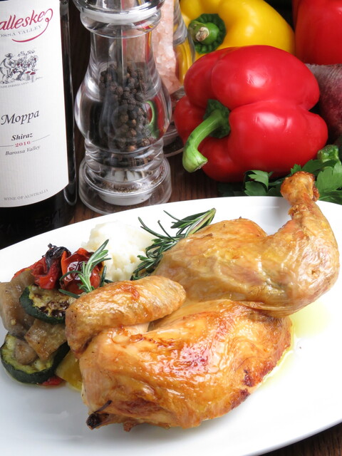 専用オーブンでじっくりと黄金色に焼かれたチキンは、柔らかくジューシー、身もしっかりつまって食べ応えも十分。ランチやテイクアウトでもロティサリーチキンの提供あり。