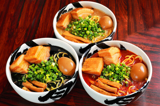 麺屋武蔵 武骨の特徴は、白、黒、赤の3つのスープ。「白」は濃厚な豚骨ベースのベーシックなスープで、「黒」にはイカ墨とにんにくを、「赤」には特製辛醤を合わせ、ほかでは味わえない唯一無二の味に仕上がっている。