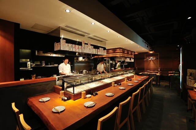 高級感あふれる店の1階には、職人が調理をするオープンキッチンを目の前に望むカウンター席、ゆっくりと落ち着いた時間を過ごせるテーブル席が並ぶ。