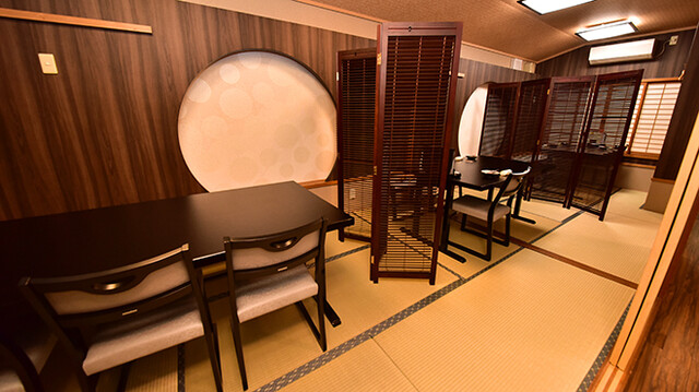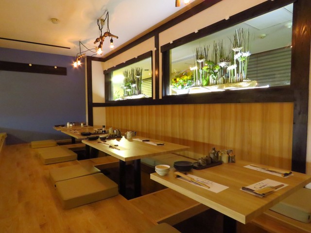 店内は落ち着いた雰囲気の和の装いで、カウンターからテーブル席、お座敷席まで用意しているのであらゆる用途で利用できる。
