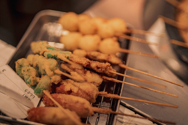JR小倉駅から徒歩5分ほど、魚町アーケード内にある「福助商店」。約20種類の串カツや鉄板料理などが人気の大衆居酒屋だ。