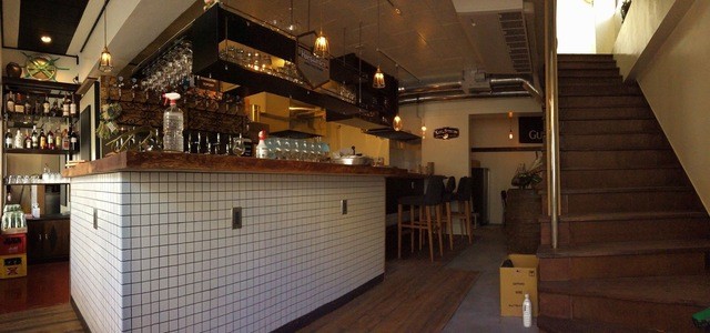 こじんまりと佇む外観から店内に入ると、海外に来たかのようなおしゃれな雰囲気に包まれる。スタイリッシュな1階にはカウンター席を用意しており、気軽な一人飲みにおすすめ。