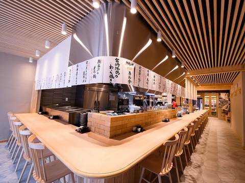 和モダンでおしゃれな店内には、一人飲みやデートにぴったりなカウンター席をはじめ、完全個室も完備しているので、会社の宴会や接待目的でお探しの方にもおすすめできるお店となっている。