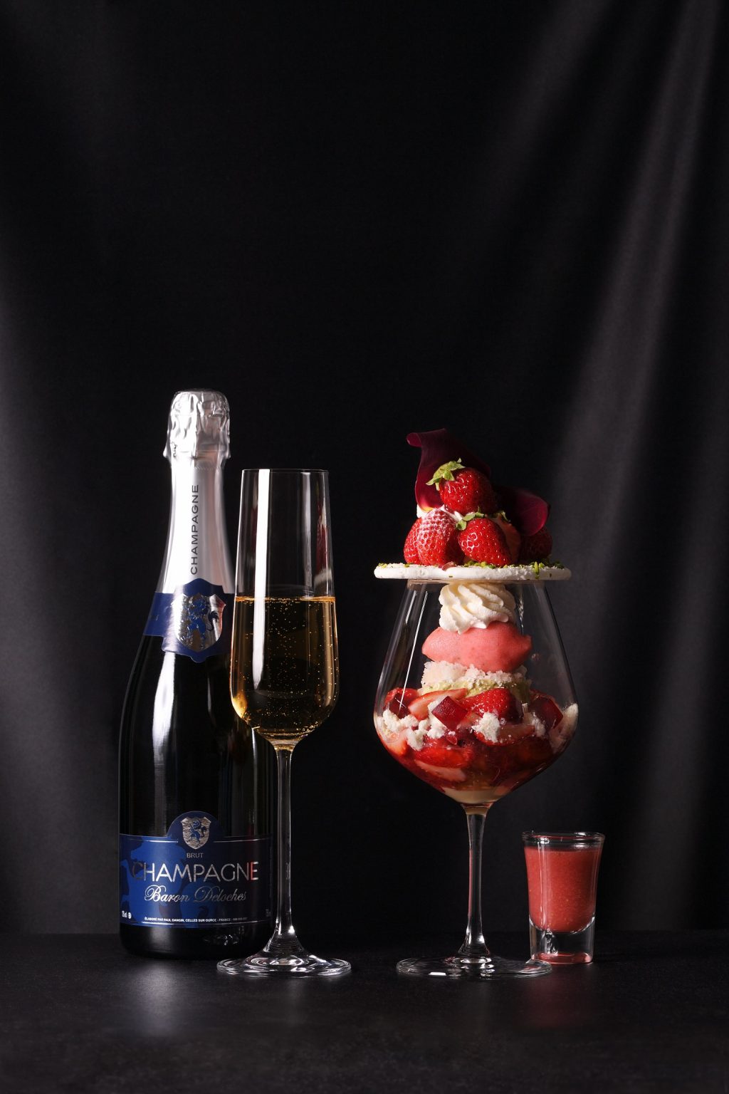 真珠のような輝きを持ち芳醇な香りと豊かな味わいの愛媛県産「レッドパール」、優雅な甘い香りと上品な甘さの愛媛県産「あまおとめ」、大粒で艶やかな紅色が目を引く甘くてジューシーな栃木県産「とちおとめ」、いちご本来の絶妙な甘酸っぱさとコクを味わえる愛媛県産「紅ほっぺ」という、いちご界を代表する希少な国産いちごを厳選しているため、1日10食限定での提供となっている。