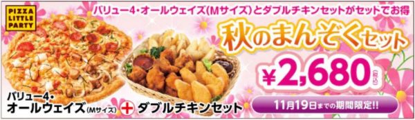 | 出前館特典 | ・1オーダーにつき、「ピザーラローステッドポテト」1個プレゼント ・10,800円以上の注文で10%割引 |