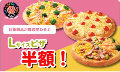 「ストロベリーコーンズ」では、不定期のキャンペーンとして週替わりのLサイズピザが半額になります。(一部店舗を除く)期間限定のお得を、ぜひおいしくお楽しみください。