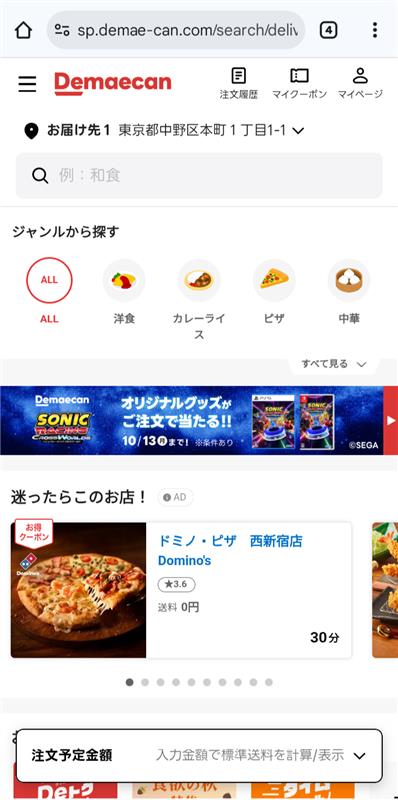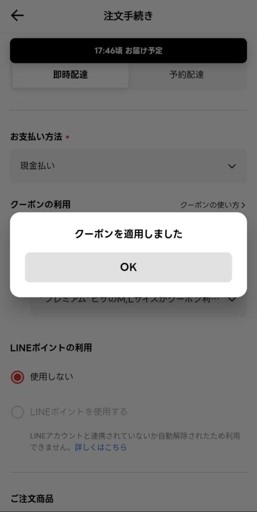 また、キャンペーンへの参加は、上記のとおり出前館のトップ画面から「クーポン・キャンペーン」のページに入り、そこから通常の注文手続きをすすめていくことで実行されます。